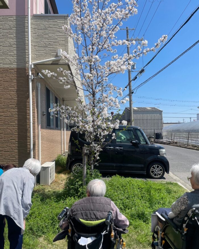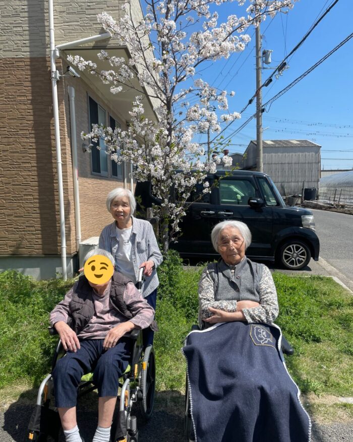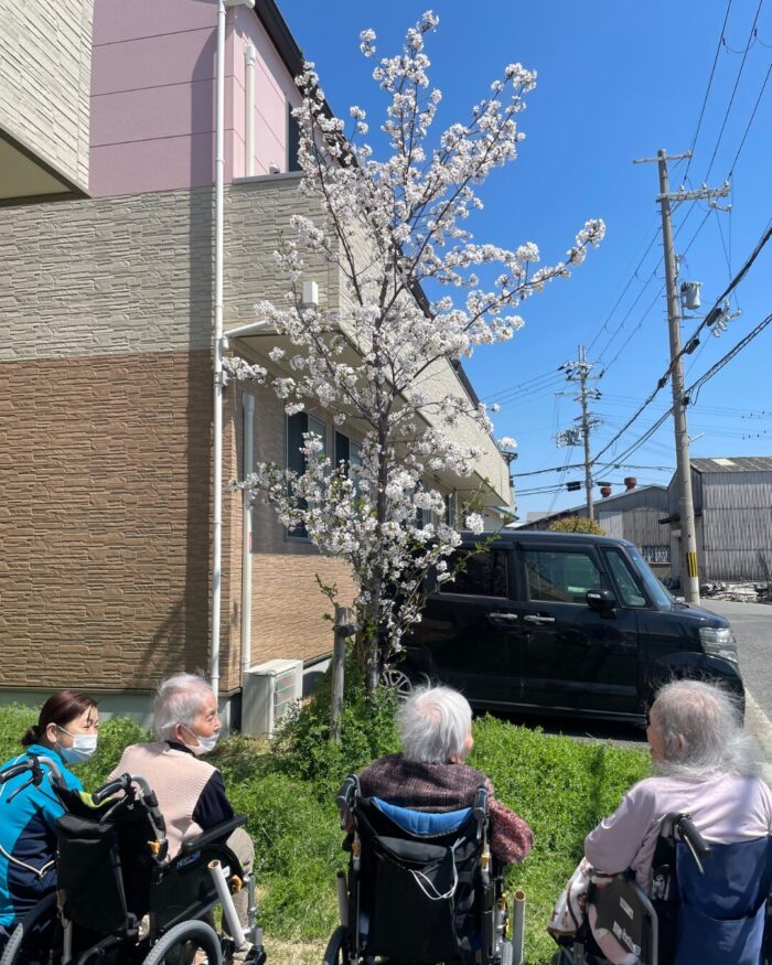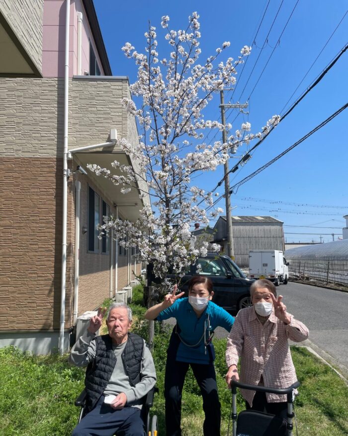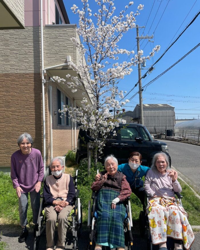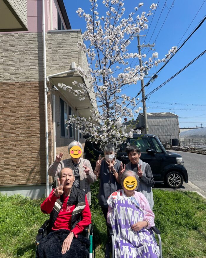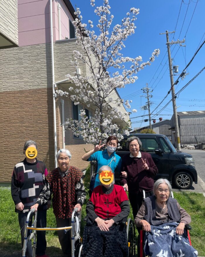 施設前の桜が満開となり、利用者様とお花見を兼ねて記念撮影を行いました!🌸