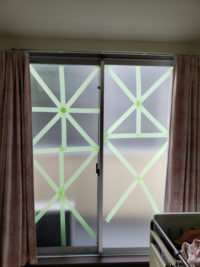 台風への備えとして、玄関には浸水防止の土嚢を置き、居室は養生テープで飛散防止の対策をしております。