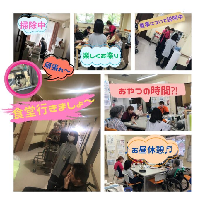 お仕事の内容は掃除・食事の誘導・配膳などをスタッフと一緒にしてもらいました。