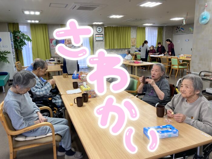 好きな飲み物を飲みながら、時代劇映画を見たり、ニコニコお話しながらおやつを