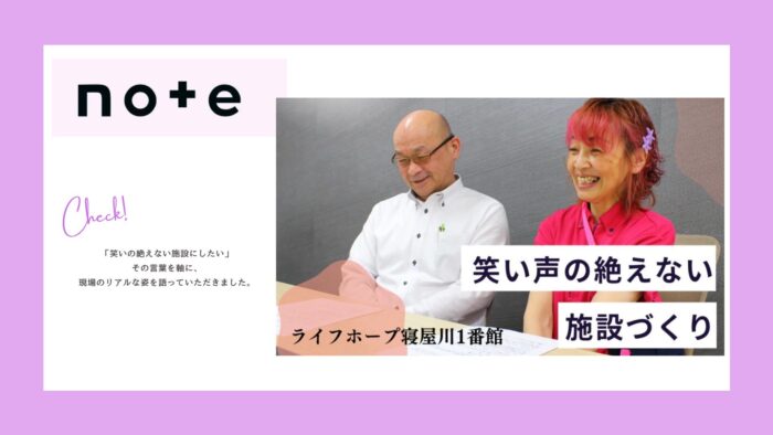 エッセイ 2026.3.27 note📖「笑い声の絶えない施設づくり」更新しています‼️ 今回の記事は寝屋川1番館“施設長”近田さんと“サ責セカンド”熊岡さんのインタビュー内容となっています🎀 寝屋川1番館が目指すケアのかたちについてお話をさせていただきました✨ 💜記事はこちらから💜 一覧に戻る →